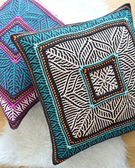 In contrast to these two previous patterns (which could be joined into an infinity crochet fabric), the Arcadia pattern presents a more traditional square shape with three ornamental sections divided with slim borders.