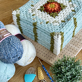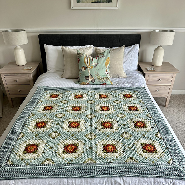 The blanket is made of sixteen identical squares and easily adaptable to other sizes. The pattern gives details of yarn used for each individual square so you can easily work out how much yarn you need if you want to make it bigger. My blanket is 120cm x 120cm.