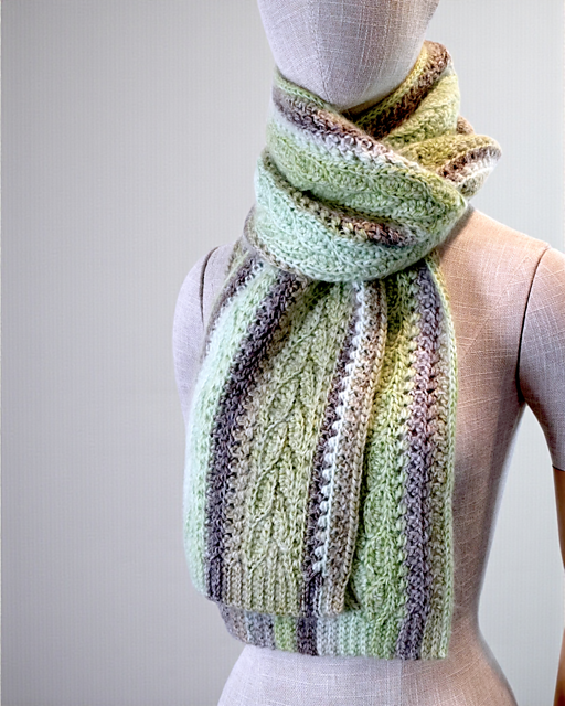 width. Choose a rather lofty yarn to reduce the scarf's weight and thus the load on your neck. Solid colors, hand-dyed yarns, or tweeds. Variegated yarns will obscure the stitch pattern. Avoid using very contrasting color-changing yarn; it will detract from the appearance of the stitch pattern. A z-twist yarn will give a different stitch definition; not all can be recommended.