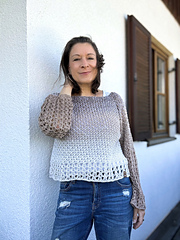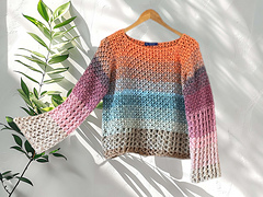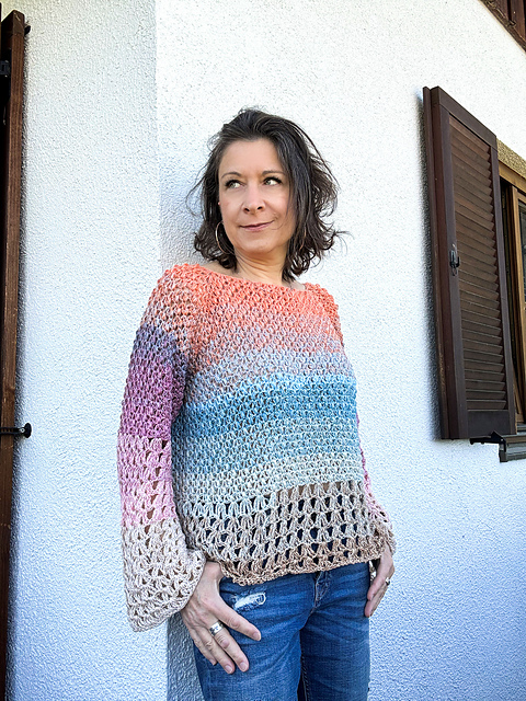 This airy top-down raglan sweater is your next must-make project! Crocheted with dreamy gradient yarns, featuring two relaxing stitch patterns and a touch of boho flair – perfect whether you're an advanced beginner, a confident crocheter, or a seasoned pro. It's a meditative, modern, and versatile piece you'll love to wear.