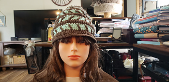 You can use any Aran weight yarn for making this hat. You will need approximately 75 yds of Color A, 18 yards of Color B and 70 yds of Color C.