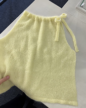 The Nora Bow Top is worked from the top down using 5 mm / US 8 circular needles and two strands of mohair held together.