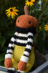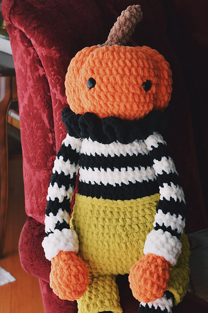 This pumpkin man works up to be approximately 29" from head to toe. The pattern is laid out in order he is crocheted to ensure minimal sewing. All colors and yarns used are noted in the pattern. I've provided pictures in the pattern to help with the tricky parts!