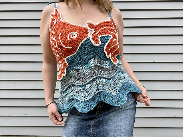 Calling all Pisces and fish lovers and water fanatics, from salt to fresh! The Fish You Were Here Tank Top (or dress) is here for your next crochet adventure! This made-to-measure crochet pattern is a fun voyage into your crochet artistry. There are plenty of pages to help you with construction and surface crochet. The stitches are easy, but the construction is a bit advanced and includes some sewing, so I am labeling this one Advanced. An overwhelming amount of testers considered this Intermediate, though, and here are more perks to this pattern: