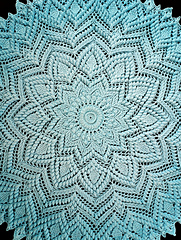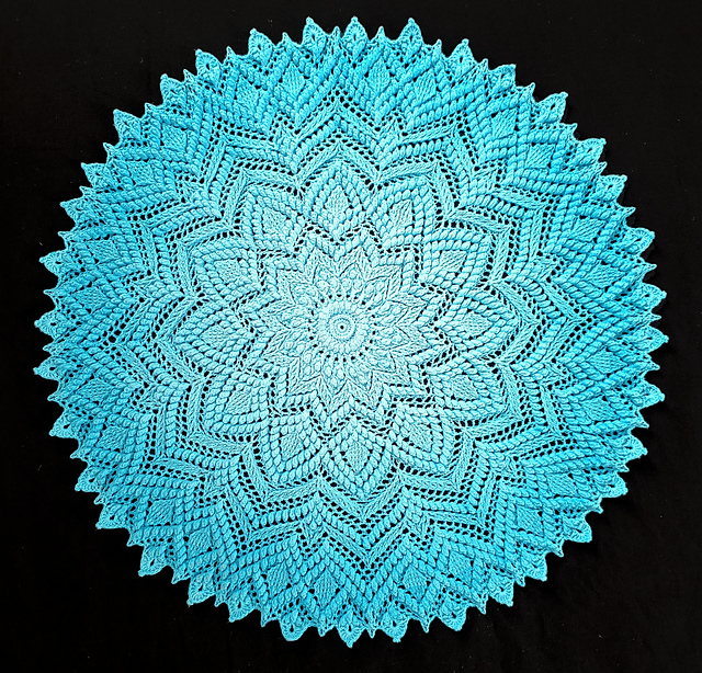 Your tension will determine things like hook size, yardage, finished size, and height of stitches. Any of these things can be adjusted as needed. Using recommended thread and hook this pattern will use minimum 950 yards / 920 metres of thread. And your finished doily will be about 20” / 51 cm in diameter.
