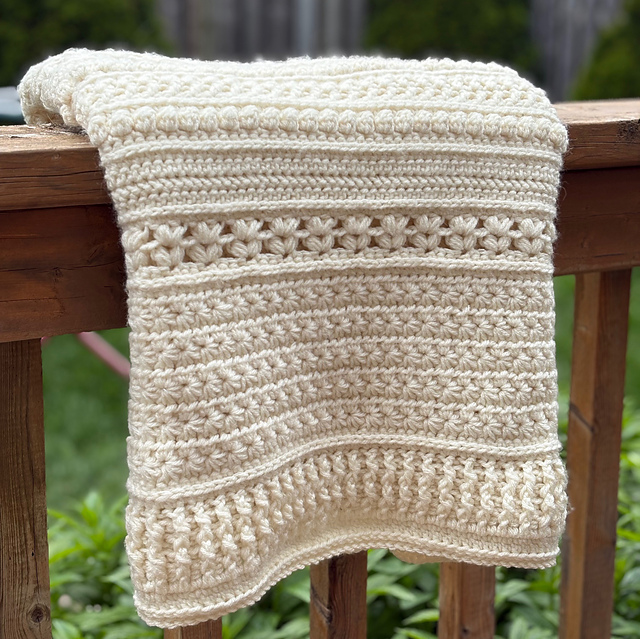 This is a lovely textured blanket. Simple to crochet but keeps things interesting with a variety of stitches. Photos are included in the stitch guide to help you. This pattern is intermediate level.
