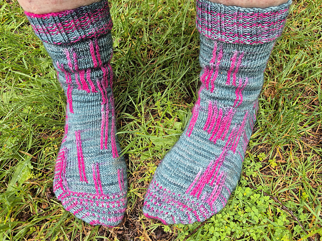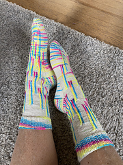 A sock pattern for multi-coloured, variegated, gradient yarns where one colour is accented throughout.
