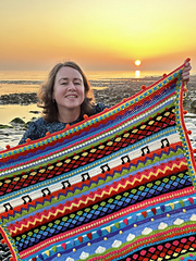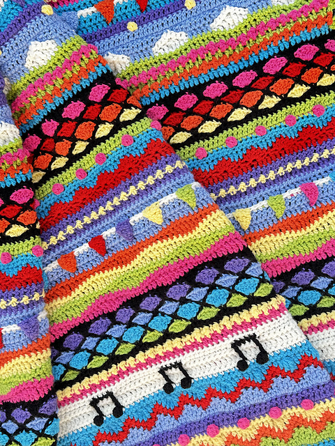This blanket is a colourful celebration of festivals, gatherings, parties and feasts! Worked in rows with an eclectic mix of crochet stitches, textures and bright, happy colours, this blanket is inspired by that festival feeling - a true feast for the eyes!