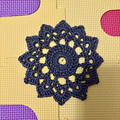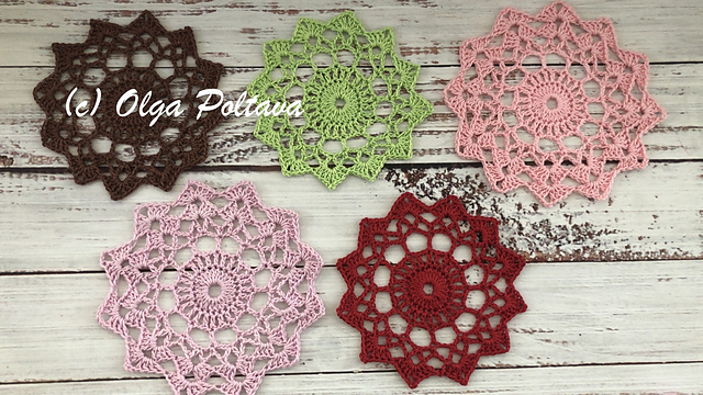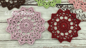 This is a small beginner-friendly doily made with a lightweight 100% mercerized cotton yarn, category 2 (such as YarnArt Begonia yarn) and a 3.5 mm hook.