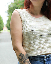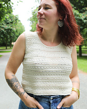 Caspica is a top-down tank top, with wide straps and a cropped-length body. It has a bit of positive ease and works well with a flowing skirt or a pair of jeans for a casual look. The neckline is curved and all finishes are done using 1/1 ribbing. The motif is simple and repetitive, to achieve a slightly openwork style.