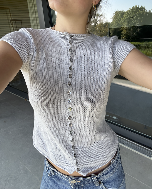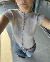 SilhouetteTop is knitted from the top down in a light bamboo mix. It features small buttons along the center, allowing for various styling options. Increases and decreases are made throughout the work to shape it to the feminine silhouette, creating an elegant fit.