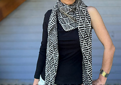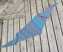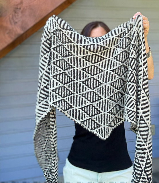 It’s a sideways-knit, shallow triangular shawl that can be also worn as a scarf, worked entirely in easy intuitive mosaic, gradually increasing to reach the desired width, then decreasing. Modification instructions for smaller/larger shawl are included.