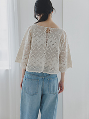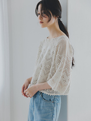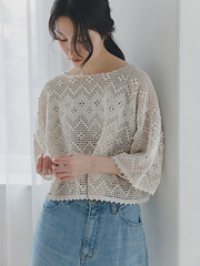 透け感と凹凸の編み地のコントラストが相まって奥行きのあるウエアに仕上がります。縁に編んだピコットもかわいらしいですね。透け感があるので、インナーとの組み合わせを楽しんでいただける1枚です。