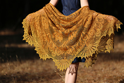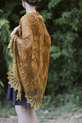 My project page can be found [here][3] and shows the smallest size, in a heavy lace weight. It measures 205x100cm (80x40in) after blocking. I used 2 colours (Old Gold for the main and Antique Brass for the edge) to recreate the golden leaves and yellow flowers of the text, but it is written as if worked in a single colour.