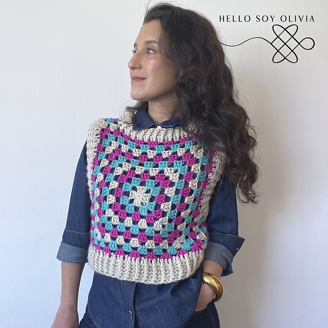 El Pixel Vest es una prenda que está tejida a partir de un granny central al que se le adicionan vueltas en los costados para generar los rebajes de sisas y de cuello. Es una prenda simple de construir y la puedes tejer en lana, acrílico, merino, alpaca u otra fibra mas invernal para el frío, o bien en algodón, bamboo, lino, para una materialidad más liviana y transformar el vest en una prenda veraniega, tipo top.