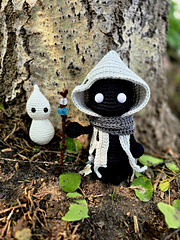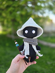 the clothing portions worked flat. The Wraith measures approx. 8” tall. This measurement is when Sport Weight Yarn (2) and a 2.75 mm hook are used. Any weight yarn and correlating hook size could be substituted as long as all the colors of yarn are the same weight.