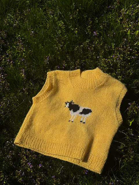 The Besty Vest, is a cozy oversized vest knit flat. First working the back panel then picking up stitches along the shoulders to create a seamless look. German short rows are worked to shape the shoulders then the rest of the panel is worked adding the cow motif in the middle of the front panel. It is finished by seaming the sides and working the arm holes and neckline.