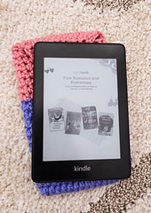 -Approximately 39 grams or 90 yds (82 m) of worsted weight yarn for e-reader cozy, 60 grams or 110 yds (100 m) for medium book cozy, and 73 grams or 170 yds (155 m) for large book cozy. I believe the purple I used is Lion Brand Wool Ease (it didn’t have a label) and the pink I used is Red Heart Super Saver in Light Raspberry.
