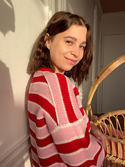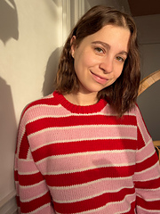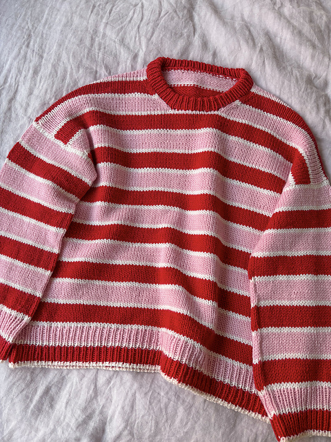 The Shortcake Sweater is worked from the top-down in stockinette stitch with stripes. The back shoulders are worked flat and shaped using short rows. The front shoulders are then worked from the top-down and joined to form the front yoke, which is then worked flat. The front and back sections are then joined at the underarms, and the body is then worked in the round. Stitches are then picked up along the armholes to work the sleeves in the round. Stitches are then picked up along the neck hole to work the folded neck trim in the round.