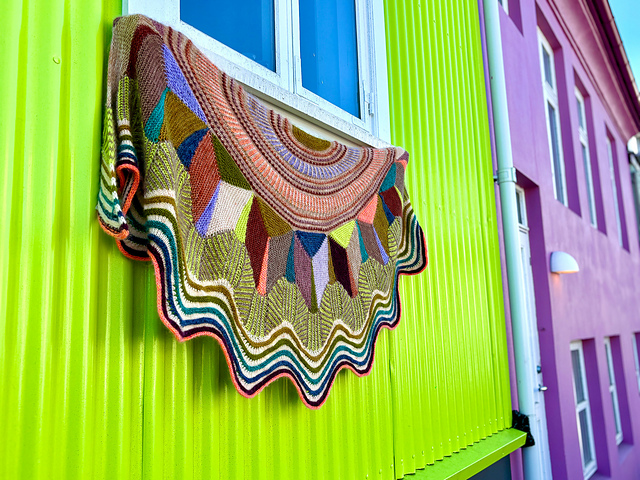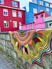 *This colorful stashbuster is knitted with fingering weight yarn for light and flowy fabric. I held coordinating shades of lace weight mohair together with my fingering weight yarns for an optional fluffy halo in the fabric. The shawl begins with garter stitch parallelograms and short row wedges in the center of the shawl. Once the long color blocked strip is created, triangles fill in the negative space with a seamless modular technique. Each section is picked up or knitted together with the previous section for a bold quilt-inspired effect. The center of the shawl continues with tiny bobbles and brioche stitch with playful color pops decorating the textured stitches. Once the top section of the shawl is complete, stitches are picked up for a brioche chevron section followed by wavy stripes. This eclectic design is inspired by the colorful houses of Reykjavik, capturing that cozy feeling of cafe knitting and warm woolly walks to the local pool.*