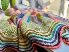 The sample features several colors of Life in the Long Grass Singles, Punk Rock Uniocorn Soul, West Wool Bicycle, & Mominoki Sock Fine 4ply held together with coordinating shades of West Wool Glowhair. Use as many colors as you like to customize this stashbusting shawl. I used about 19 colors of fingering weight wool in my shawl.