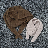 **Barista Scarf** is worked from tip to tip, in garter stitch with eyelets. The eyelets help to keep track of the shaping. The I-cord edges are worked along, at the same time.