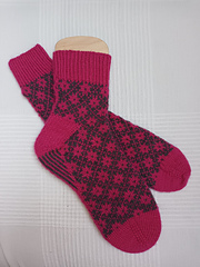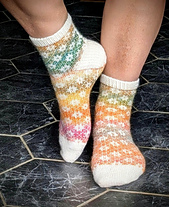 **Construction notes**: These socks start from the toe using Judy's magic cast-on. We shape the toe with lifted increases. When you reach the instep, join the contrast colour and follow the colourwork chart. Rather than the sides, the gusset increases are at the bottom of the sole. The bottom of the heel is shaped using short rows, then a slip-stitch heel flap is worked back and forth in the main colour. Follow the colourwork chart again for the leg until you reach your preferred length. Finish with an i-cord bind-off.
