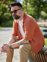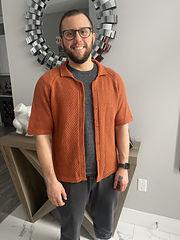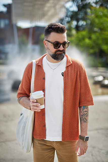 The *Whisky Sour* shirt is knitted flat with raglan sleeves. First, a faux “double-knitting” collar is knitted in the round from an invisible cast-on. Short rows are worked into the collar and at the start of the body to lengthen the back. The button band is added last by picking up stitches along the front edge.