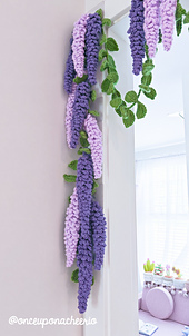Bring a touch of spring indoors with this whimsical wisteria garland, complete with soft cascading blooms and leafy foliage. Inspired by real wisteria vines, this decorative crochet pattern is perfect for nurseries, mantels, party backdrops, or anywhere you want a floral pop of charm.