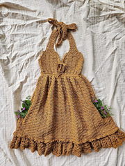 Aster is worked all in one piece from the top down, no seaming is required for this project. The bodice is created starting from the halter straps, then shaping the neckline to your desired depth. After the neckline is complete, length and width are added to the bodice before being joined in the round with an extension chain to create the elastic waistband and skirt foundation. The skirt is worked to your desired length, with built-in pockets added as you go, before adding the flouncy, tiered flutter hem. Decorative peekaboo ruffle edging is added at the junction of the skirt tiers, as well as the neckline, then the pockets are lined with the fabric of your choice to add durability.