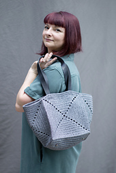 This tote is constructed out of five squares. The body of the tote is made out of four equal granny square panels using a centered double crochet (cdc) pattern worked in the round. While the tote's bottom is worked flat with a slipped double crochet stitch pattern. Once all five parts of the tote are completed, they are first steamed to match identically, the four granny squares are then pleated diagonally with steam. The tote's panels are then seamed together to form a circle/loop, and the bottom part is attached to the body of the tote using a slip stitch method. The tote's opening is reinforced using slip stitch. Once all the ends are woven in, the seams are steamed. Tote's fabric can be reinforced by spraying with a stiffening solution on the inside and/or on the outside. When the tote is completely dry, the handles are stitched at the opening of the tote, and purse feet are installed and magnet closure is sewn in (if desired).