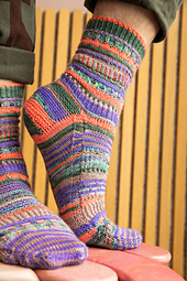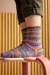 *These top-down socks feature five mini skeins (20g each) of fingering weight sock yarn. Gather a contrasting palette and enjoy lots of textures like twisted ribbing, dip stitches, brioche, eyelets, slip stitches, and short rows. There are also instructions for a non-brioche section. These socks are packed with delectable stripes and collectible stitch patterns, making them very addicting to knit. Each section is accompanied by a video tutorial demonstrating all of the techniques step-by-step to knit these fabulous color pop socks.*