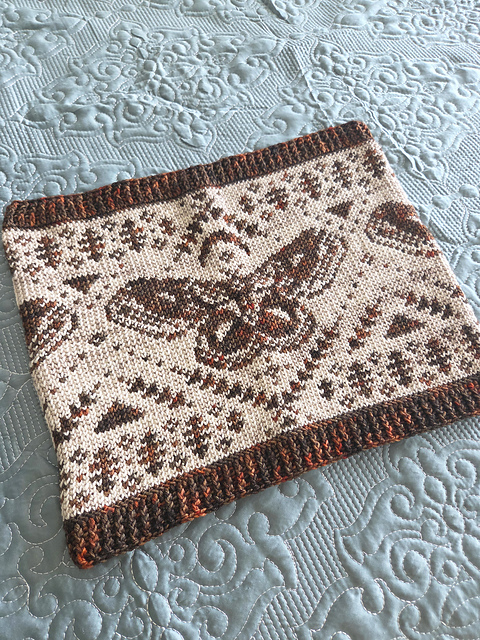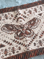 The Cecropia Cowl is inspired by the beautiful moth my husband and I found on our way home from the local peony garden. It was the first time either one of us had seen a silk moth of this size in person. After tons of Googling and reading about how short and tragically beautiful their lives are, it just made sense to memorialize the species in a pattern. The colorwork chart in this cowl includes a border that mimics the moth’s antennae, as well as several nature-inspired motifs around the main moth graphic.