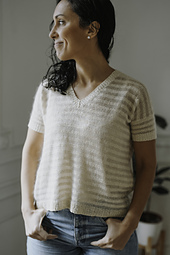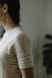 The difference with previous versions are: a V-neck shape, less positive ease, and a smaller gauge to adapt to the lovely silk yarn used in this sample.
