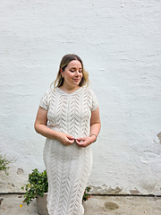 The Ebba skirt is knitted seamlessly top-down with a lace pattern that looks like cables. The waistband is folded, and an elastic band is added at the end. The lace pattern is knitted without the eyelets until you reach past the “underwear area” so that your undies won’t show through the holes of the lace.