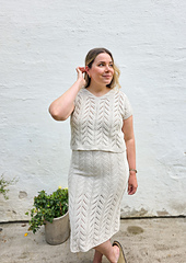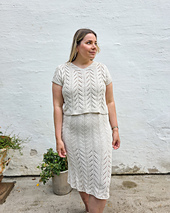 For the stitch patterns to show best, I recommend choosing unicolor or slightly tonal colorways. The Ebba tee is worked in DK weight yarn but you can also knit it by holding one strand of fingering weight yarn together with a strand of silk mohair.