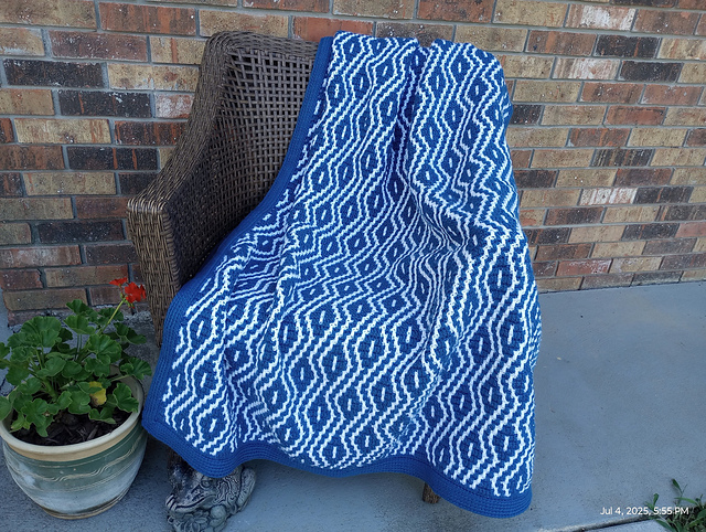 Yardage calculation is well explained, and blanket sizes are listed in the pattern from small throw to king so you can calculate how much yarn you will need. A small 52x60 inch throw in worsted weight yarn will require approximately 1855 yards color A, and 1680 yards color B, where Color A is the beginning color and the detail color. This does not include the yardage needed for an envelope or fringed border and can vary depending on tension and/or hook size.