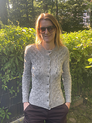 **Techniques used**: Lace knitting, lifted increases, Backwards loop cast-on, knitting in the round, yarnover buttonholes, Knotted k2tog bind-off.