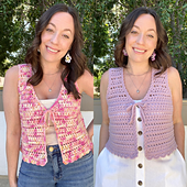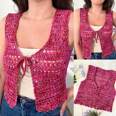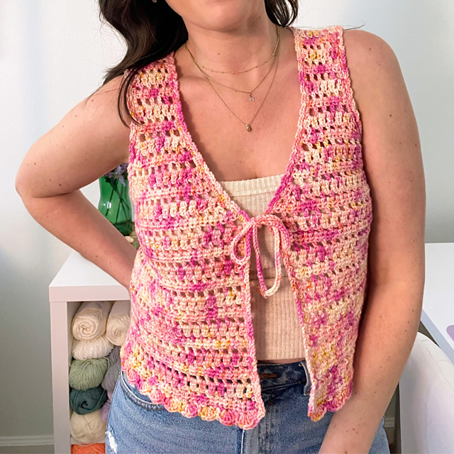 Are you looking for a cute tie vest pattern for summer? The Summer Treat Vest is made in one-piece with a mix of stitches that gives it a light and airy fit! This made-to-measure crochet pattern can easily be made to fit all sizes, allowing you to use ANY yarn you love to make a fun summer outfit!