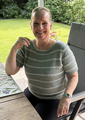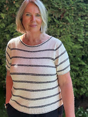 Starting with the neckline, the back and front top yoke. The sleeve stitches are then picked up and joined in the round before starting the first stripe. A small contrast row is added at the end at the cuffs. Line, the yarn of the Lotte shirt, not only wears well in high temperatures, it also knits well when it's hot.