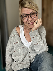 Knitting starts with the cast-on of the shoulders for the back. Once the short row shaped shoulder slopes are done, the back is worked flat to underarm. Shoulder stitches are picked up to work both fronts to the same length. At underarm both fronts and back are joined to work the body top down back and forth to the bottom hem. A provisional cast-on for the pocket openings allows for seamless built-in pockets. The button band is worked next. Sleeve stitches are picked up around the arm openings to work the sleeves top down in rounds to the cuffs. Pocket linings are worked last.