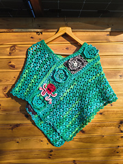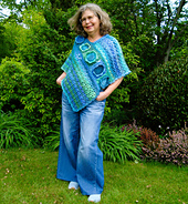 A fun crocheted poncho with large flowers and crazy stitch pattern. Use any yarn and colours you like, to create your own personal accessory.