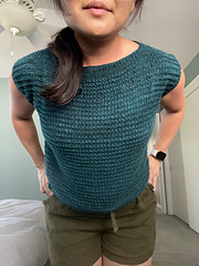 This sweater is knit from the bottom up. The front and back hems are worked flat separately, then joined and worked in the round to the underarms, where the front and back are split again and worked flat separately. Shoulder shaping is worked with short rows in 1 x 1 ribbing, then stitches are bound off for the front and back necks. The shoulders are seamed with three needle bind off technique. The sleeves are picked up and finished with a short ribbed band.
