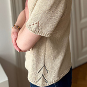 **Dara Tee** is a casual tee with a round neck. It’s worked primarily in Stockinette stitch. Purled ribs at the lower body under each arm and at the center underside of each sleeve form faux seams. The eyecatchers are the lace pattern triangles which embellish each side of the lower body and the center of each sleeve, just before the bottom ribbing. The tee is worked top down in one piece, first in rows, and after completing the front neck shaping, completely in the round. Increases shape the neckline, shoulders, body, and sleeves until the armhole depth is reached. Once the upper body is finished, the sleeve stitches are put on hold and the lower body is worked down to the bottom. Stitches are picked up around the neckline and the ribbed neckband is worked in the round. Finally, the short sleeves are worked in the round.