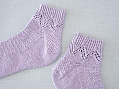 **Hour Lilies** are socks designed for the Yucca Mystery KAL 2025. They are worked from the cuff down, and when you finish the chevron lace cuff, you will see the Hour Lilies blooming. The leg and instep are worked in seed stitch, scattering tiny seeds, while the heel and toe feature the Quilted Lattice pattern. You can choose the leg length between ankle or crew, depending on your preference. The sample is shown in ankle length. Video tutorials are included.