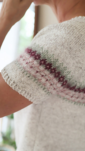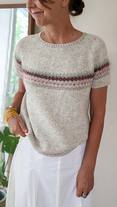 The FLOWERiNG STONE tee is worked seamlessly from the top down. Start working in the round and shape the neck with short rows. Then work combined increases for the yoke, while doing some colorwork before separating for the sleeves. The body is then worked down to the colorwork and bottom ribbing. The sleeve sts are picked up to work the sleeves, short or long, in the round top down.