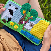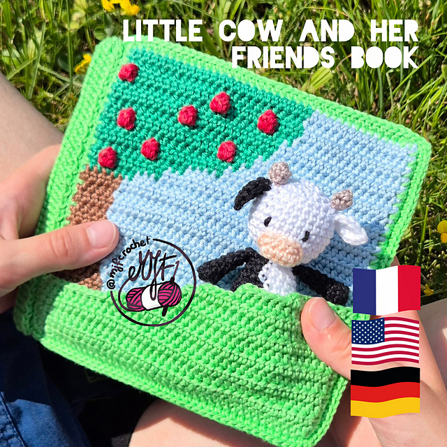 A crochet pattern (French, English and German) for a crochet book (about 15cm) that tells the story of little cow and little bull (both about 7-8 cm). The pattern contains the book, the cow and the bull. The book is composed of 6 pages in which little cow can act each time. She plays in the mud with little pig, eat dandelions with big cow, plays hide and seek with little sheep and little bull, and many more little surprises.