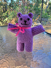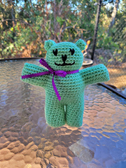 Teddy bear is worked in the round and can be crocheted with any medium weight yarn. Using RHSS yarn and a G hook results in a bear standing 8.5" tall.