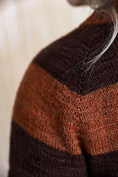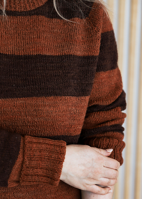 Cinnamon & Clove is a lovely raglan sweater with bulky stripes. The sweater is worked top-down seamlessly. The sweater starts with a folded neckband ribbing and continues with short row shaping and raglan sleeves. The sweater has a relaxed fit and long raglan sleeves. Bulky stripes give the sweater a lovely, robust look. As the stripes are quite wide, it’s best to break yarn in between and not carry along.