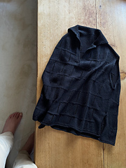 The glimmer polo is a sleeveless, straight line polo. The light texture with the featured eyelets let the sunlights drops through in the soft breeze. The polo’s compact collar with no button makes its impression sharp, and the collar can be arranged to the sailor collar by knitting the ribs longer.